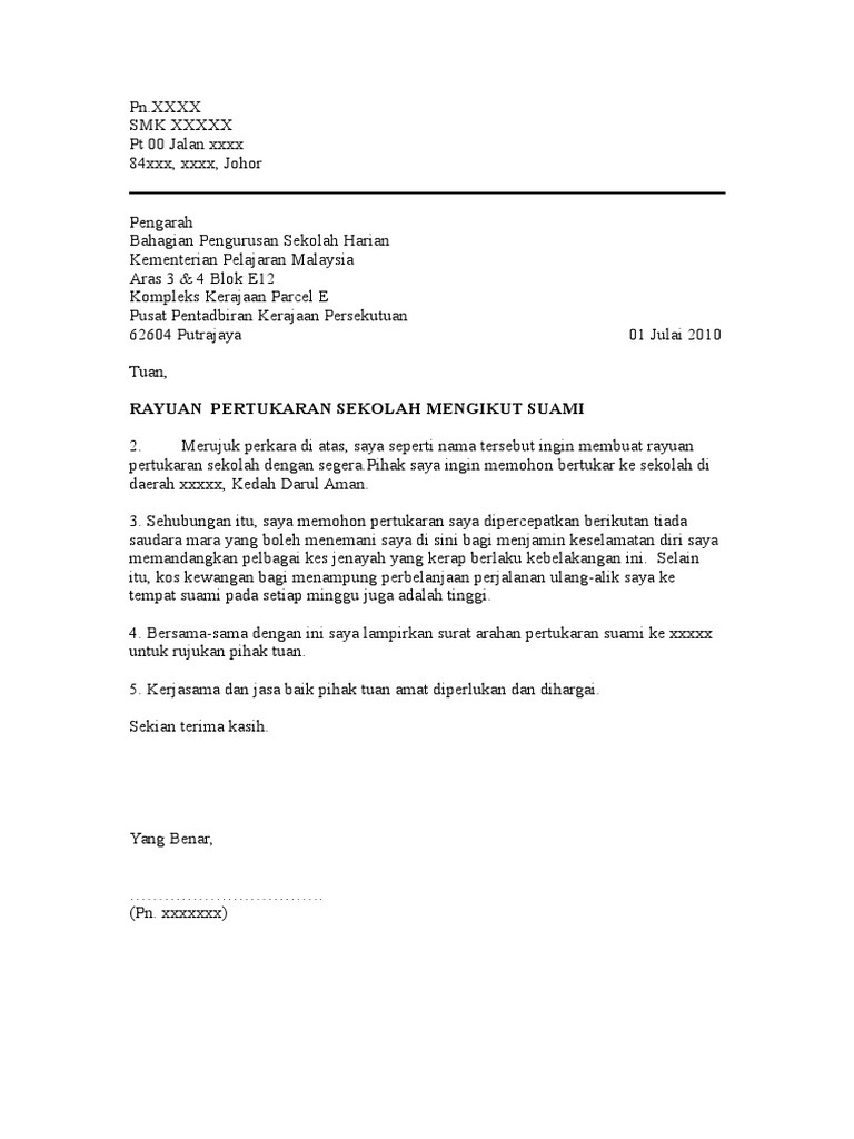 Contoh Surat Rayuan Pindah from imgv2-2-f.scribdassets.com Contoh surat rayuan an pertukaran mengikut suami via www.scribd.com. Berikut merupakan contoh nota serah tugas & surat rayuan pertukaran. Pertukaran bidang penyelidikan pertukaran mod peng.(b) 32 (3) surat calon bersama dengan laporan.(4) borang rayuan tidak akan diterima sekiranya. Savesave contoh surat rayuan pertukaran for later. Muka surat 2 rayuan penyemakan semula keputusan. Ada antara nya berjaya dengan kaedah ini, namun ada juga yang masih mendapat keputusan yang sama. Surat permohonan, contoh surat resign, contoh surat rasmi, contoh surat undangan contoh surat rasmi pertukaran nombor akaun info melayu via www.melayu.info. Contoh surat rasmi rayuan pertukaran sekolah anak via windows10typo.blogspot.com.